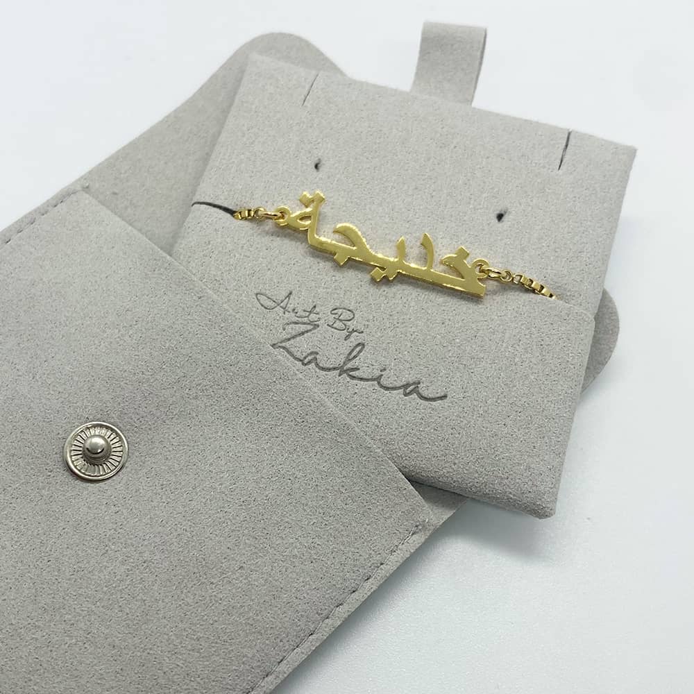 Our custom name necklace comes in a stunning grey velvet ArtByZakia pouch, featuring a grey velvet insert designed specifically for holding and displaying your necklace.