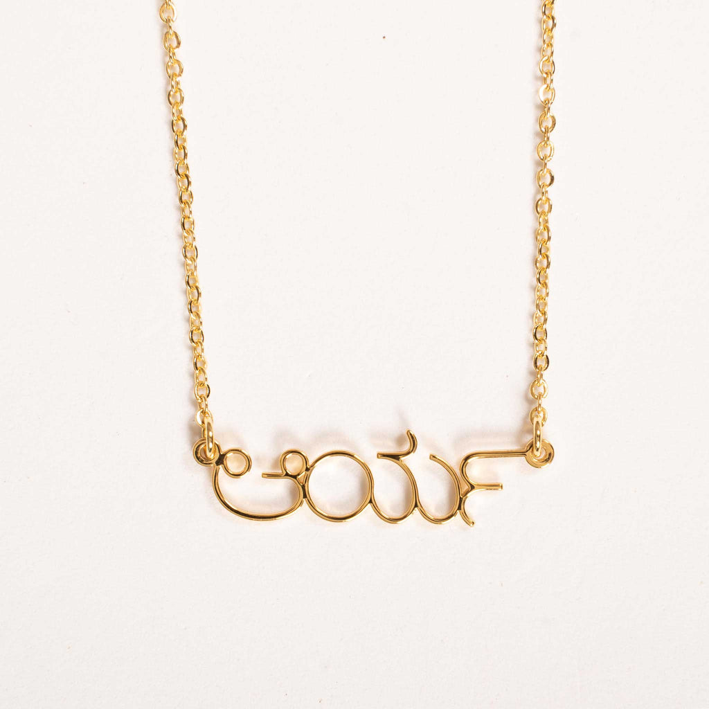 Gold necklace with engraved message on a white background